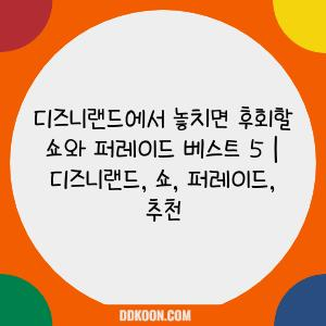 디즈니랜드는 꿈과 환상의 세계로 여러분을 초대합니다! 눈부신 조명, 신나는 음악, 사랑스러운 캐릭터들이 함께하는 쇼와 퍼레이드는 디즈니랜드의 백미입니다. 하지만 다양한 쇼와 퍼레이드 중 어떤 것을 봐야 할지 고민하시는 분들을 위해 놓치면 후회할 베스트 5를 소개합니다. 웅장한 스케일과 감동적인 스토리로 여러분의 마음을 사로잡을 쇼와 퍼레이드를 지금 만나보세요.