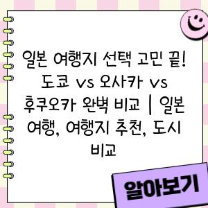 일본 여행을 계획하고 계신가요? 매력적인 도시들이 즐비한 일본에서 어디를 가야 할지 고민하시는 분들을 위해 도쿄, 오사카, 후쿠오카 세 도시를 비교 분석하여 여러분의 취향에 맞는 최고의 여행지를 찾아드립니다. 각 도시의 특징과 장단점을 꼼꼼히 비교해보고, 나만의 일본 여행 계획을 세워보세요!