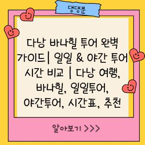 답변. 다낭 바나힐 투어는 일일 투어와 야간 투어, 각각 매력이 다르기 때문에 취향에 따라 선택하는 것이 좋습니다.