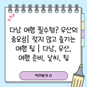 다낭 여행을 계획 중이라면 우산을 꼭 챙겨 젖지 않고 즐거운 여행을 만들어 보세요! 다음 글에서는 다낭 여행에서 우산을 챙기는 것이 얼마나 중요한지, 우산과 함께 즐기는 꿀팁들을 자세히 알려드리겠습니다.