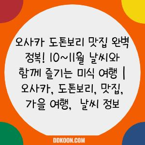 이 글에서는 도톤보리 맛집 완벽 정복을 위한 꿀팁과 함께 10~11월 날씨 정보를 알려드립니다. 맛있는 음식과 가을 분위기 만끽하며 잊을 수 없는 오사카 여행을 만들어보세요!