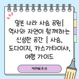 - 사슴 공원은 넓기 때문에 충분한 시간을 할애하여 방문하는 것이 좋습니다. 도보로 돌아보거나, 자전거를 대여하여 편안하게 이동할 수 있습니다. 관광 안내 책자를 참고하여 여행 계획을 세우세요.