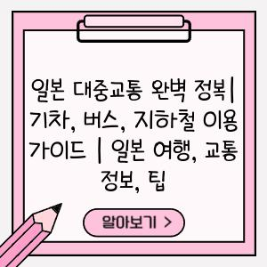 더불어 여행 경비 절약을 위한 꿀팁과 여행 중 유용하게 활용할 수 있는 앱까지 소개합니다. 이제 막막했던 일본 대중교통, 이 글을 통해 완벽하게 정복하고 즐거운 여행을 시작해보세요!