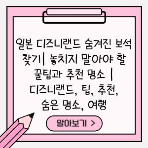 동심으로 가득 찬 꿈의 세계, 일본 디즈니랜드! 익숙한 디즈니 캐릭터들과 놀이기구는 물론, 일본만의 독특한 매력이 가득한 곳이죠. 하지만, 눈에 띄는 인기 명소만으로는 아쉬울 수 있어요. 이 글에서는 많은 사람들이 놓치는 숨겨진 보석들을 찾아 떠나는 특별한 여정을 제안합니다. 일본 디즈니랜드의 꿀팁부터 놓치지 말아야 할 명소, 숨은 재미까지, 잊지 못할 추억을 만들 수 있는 알짜 정보들을 가득 담았습니다.