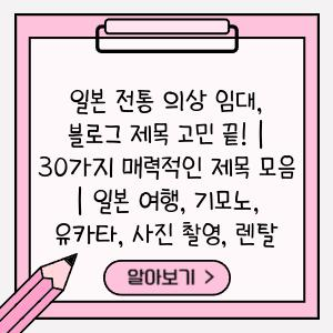 전통 의상 임대 정보 또한 블로그 제목에 담으면 좋습니다. “가성비 끝판왕! 일본 전통 의상 렌탈 꿀팁 대공개”처럼 독자에게 유용한 정보를 제공하는 제목은 블로그의 신뢰도를 높일 수 있습니다.