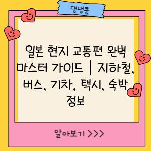 일본 현지 교통편 완벽 마스터 가이드 | 지하철, 버스, 기차, 택시, 숙박 정보 일본 여행을 계획하고 계신가요? 복잡한 일본 교통 시스템 때문에 걱정이 많으실 겁니다. 하지만 걱정하지 마세요! 이 가이드에서는 일본 현지 교통편을 완벽하게 마스터하는 데 필요한 모든 정보를 제공합니다. 지하철, 버스, 기차, 택시 등 다양한 교통 수단을 소개하고, 각각의 장단점과 이용 요금, 주의 사항을 … Read more